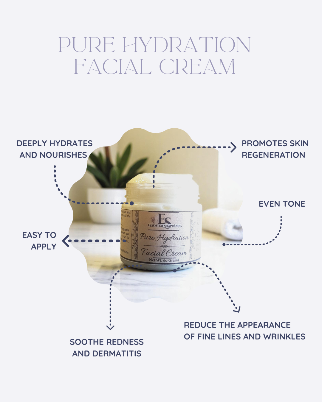 Experience deep hydration and skin nourishment with our Pure Hydration Facial Cream, a luxurious, lightweight moisturizer crafted to soothe, protect, and revitalize your skin. Formulated with a blend of botanical extracts, nourishing oils, and skin-restoring ingredients, this moisturizing cream is perfect for achieving a soft, radiant complexion.