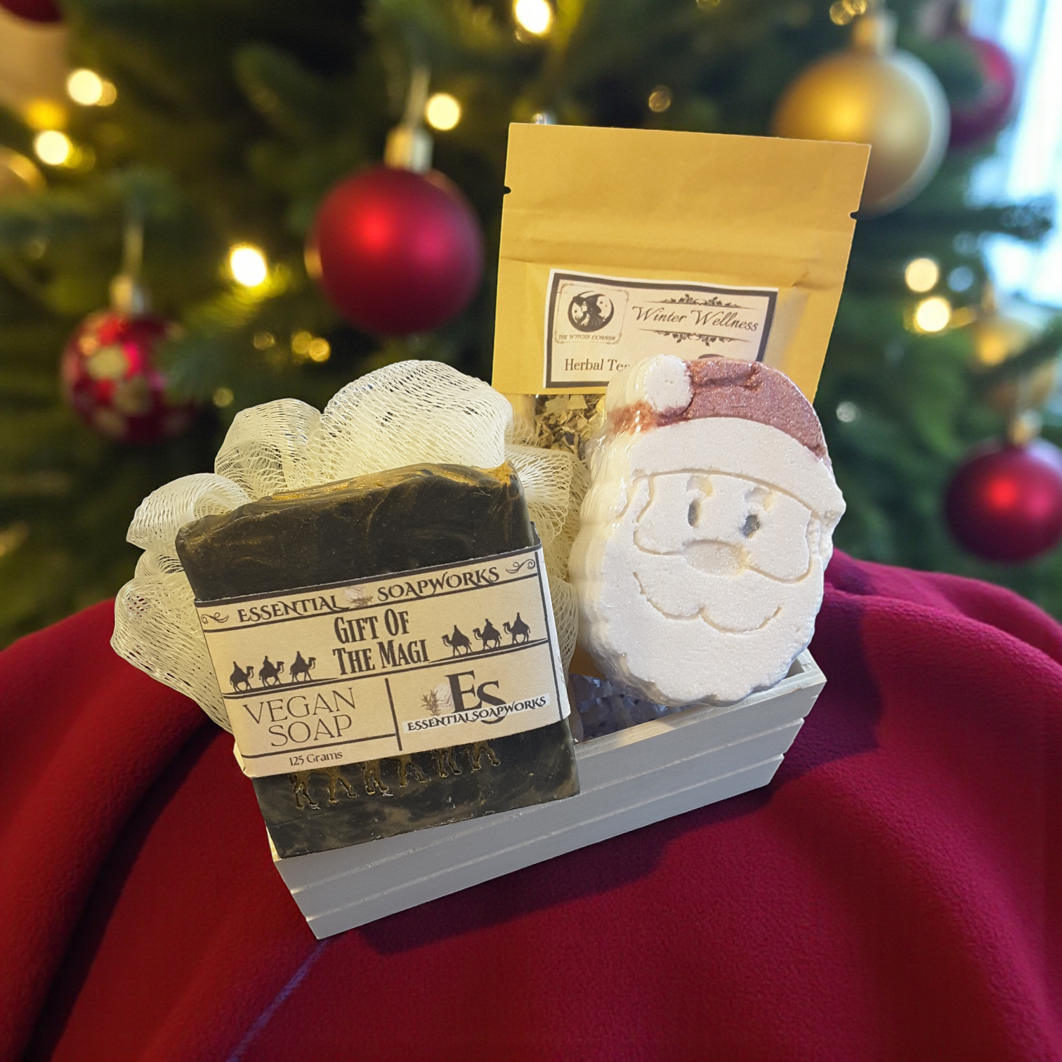 From the invigorating scent of peppermint soap to the grounding aroma of our herbal tea blend, every element works together to soothe the senses and nurture the soul. The loofah helps you shed what no longer serves, while the Santa Claus bath bomb adds a touch of festive joy to your bath ritual.